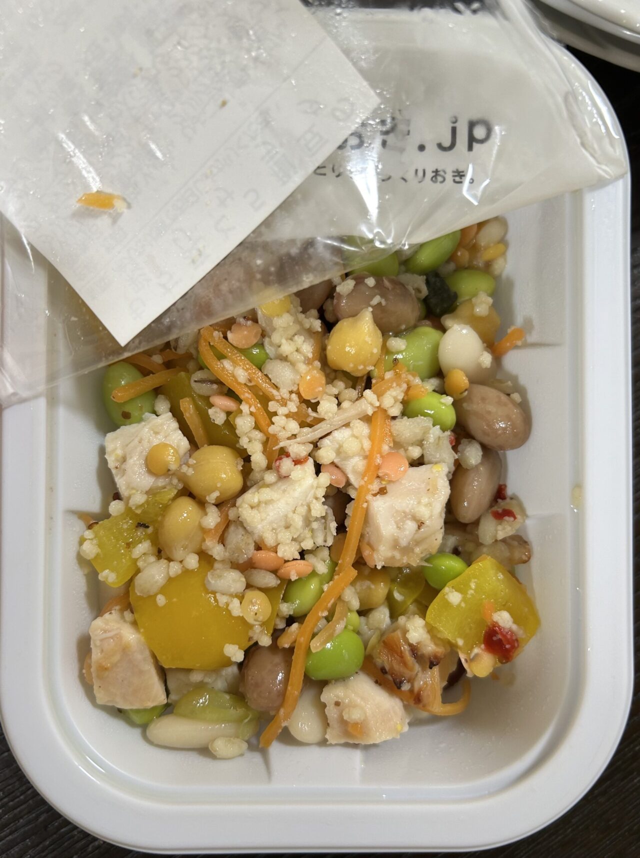 たくさんのお豆とお野菜、鶏肉も取れるというヘルシーなサラダ。こちらは「冷えた状態でお召し上がりください」という注意書きがあり、パックをあけるだけで立派な副菜になりました。