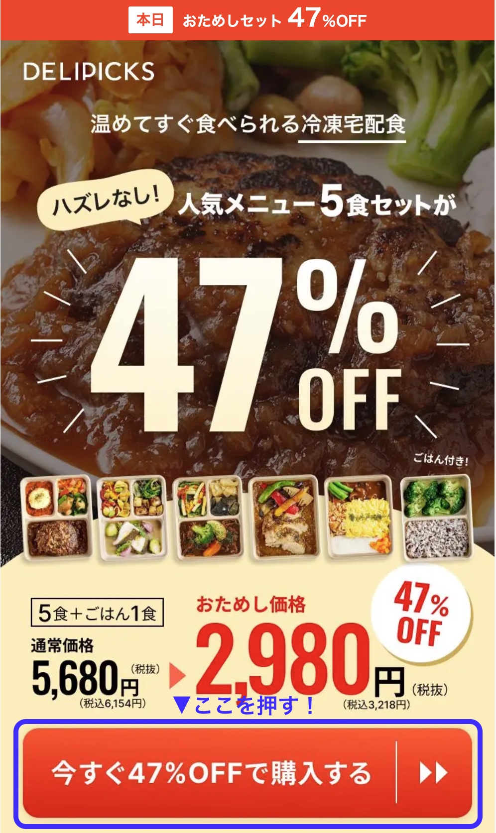 まずはDELIPICKS(デリピックス)の公式サイトにアクセスし、「初回47%OFFお試しセット」のボタンをタップします。