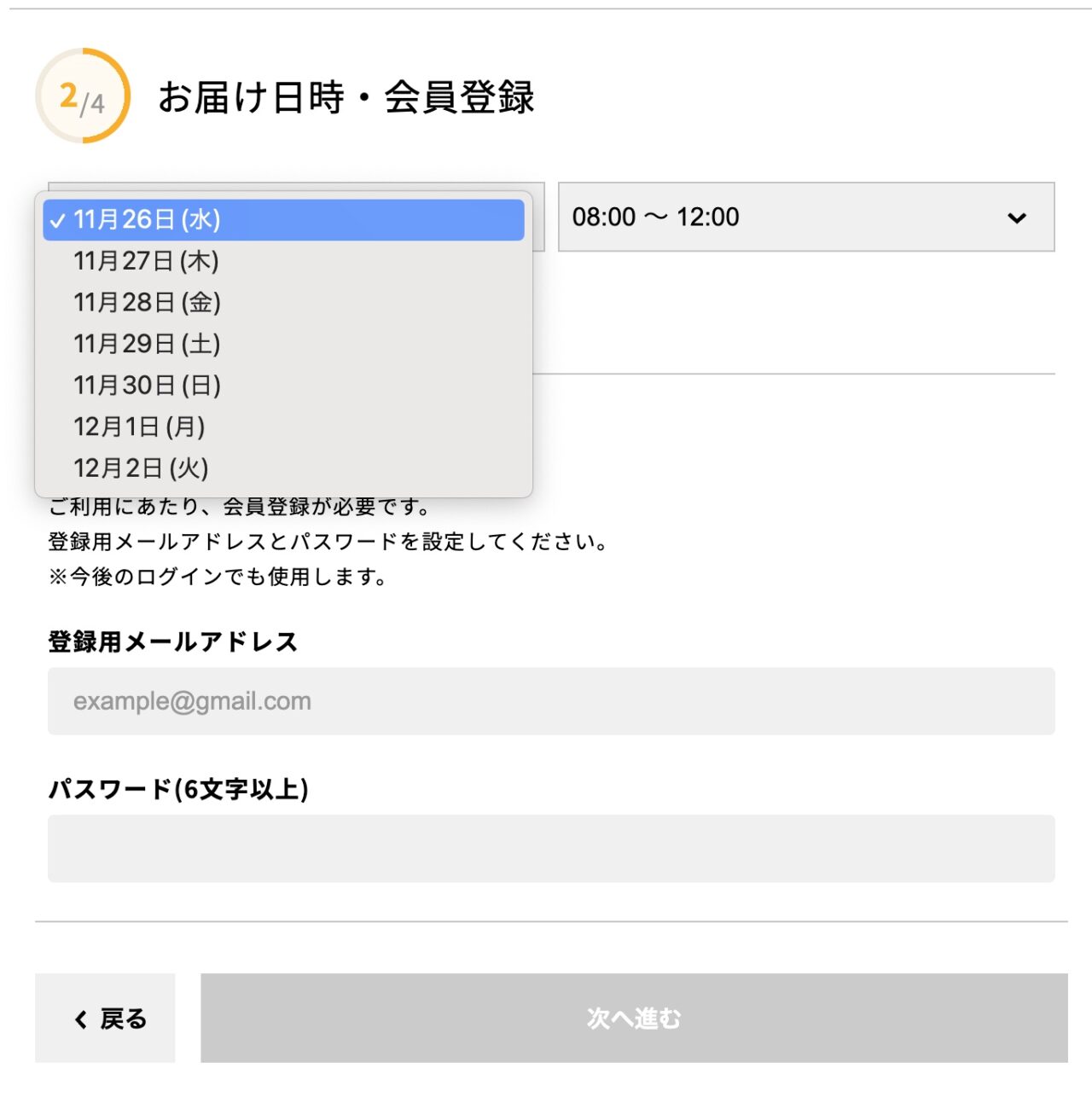 - 注文は超簡単:スマホで住所と配送日時を入力するだけ、3分で完了
